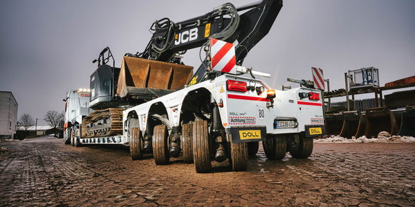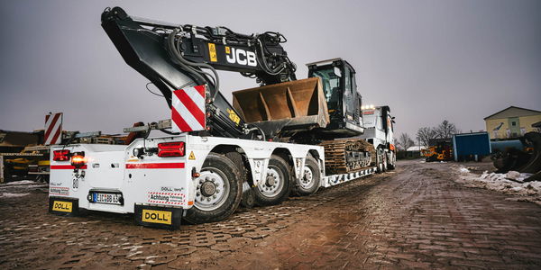 Bode Bautechnik verkauft und vermietet seit 35 Jahren Baumaschinen aller Größen – von der Rüttelplatte bis zum 37 Tonnen schweren Kettenbagger. Selbst die größten Baumaschinen liefert das mittelständische Unternehmen auf Wunsch direkt zum Kunden. Zum Einsatz kommt dabei ein DOLL® Tiefbett X mit der Pendelachse DOLL tera®. Für die Wahl des DOLL®-Aufliegers war neben der Nutzlast von bis zu 45 Tonnen ein weiterer Aspekt ausschlaggebend: „Beim Transport der großen JCB Bagger ist vor allem die Höhe des Baggerarms der limitierende Faktor“, erläutert Michael Schneider, Transportleiter bei Bode Bautechnik. „Durch die breite Baggermulde des neuen Tiefladers können wir den Arm tiefer ablegen und bleiben so unter vier Metern Höhe.“ Dies macht die spezielle Bauweise der Pendelachse DOLL tera® möglich: Das Hinterachsfahrwerk bietet Platz für eine durchgehende Mulde mit einer Breite von bis zu 900 Millimetern und einer Tiefe von 550 Millimetern. Schneider transportiert die großen Baumaschinen quer durch Deutschland, durch enge Innenstädte, über Landstraßen und steile Baustelleneinfahrten direkt an ihren Einsatzort. Dabei kommt es auf jeden Zentimeter Spielraum an: „Die DOLL tera® Pendelachse bietet mit 600 Millimetern Hub selbst an schwierigen Stellen mit großen Höhenunterschieden immer genügend Bodenfreiheit.“