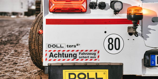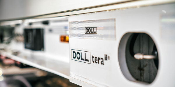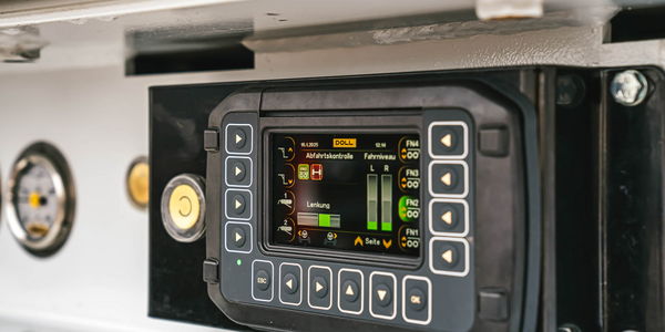 Die Bedienung des Aufliegers wird zusätzlich durch das Steuerungssystem „DOLL control®“ vereinfacht. Oder wie Michael Schneider es ausdrückt: „Abfahrtskontrolle leicht gemacht!“ Über ein 7-Zoll-Farbdisplay erhält der Fahrer auf einen Blick alle relevanten Informationen zu Reifendruck, Gewichtsverteilung, Lastpositionierung oder der Position der Abdrückzylinder. Alle Funktionen von „DOLL control®“ lassen sich auch über die Funkfernbedienung „DOLL connect®“ steuern. Für Schneider eine entscheidende Erleichterung im Arbeitsalltag: „Bei unserem alten Auflieger musste ich zum manuellen Nachlenken aussteigen und eine Kabelfernbedienung am Fahrzeugheck anschließen. Jetzt kann ich vom Führerhaus aus das Fahrniveau einstellen oder in die Lenkung eingreifen.“ Wenn Schneider das Fahrzeug nach dem manuellen Nachlenken wieder einspuren möchte, genügt ein Tastendruck auf der Funkfernsteuerung: Die elektronische Einspurung (EEP)berechnet automatisch den korrekten Lenkeinschlag der Achsen. Das geschieht bei langsamer Kurvenfahrt – ein Geradeziehen ist nicht mehr erforderlich.