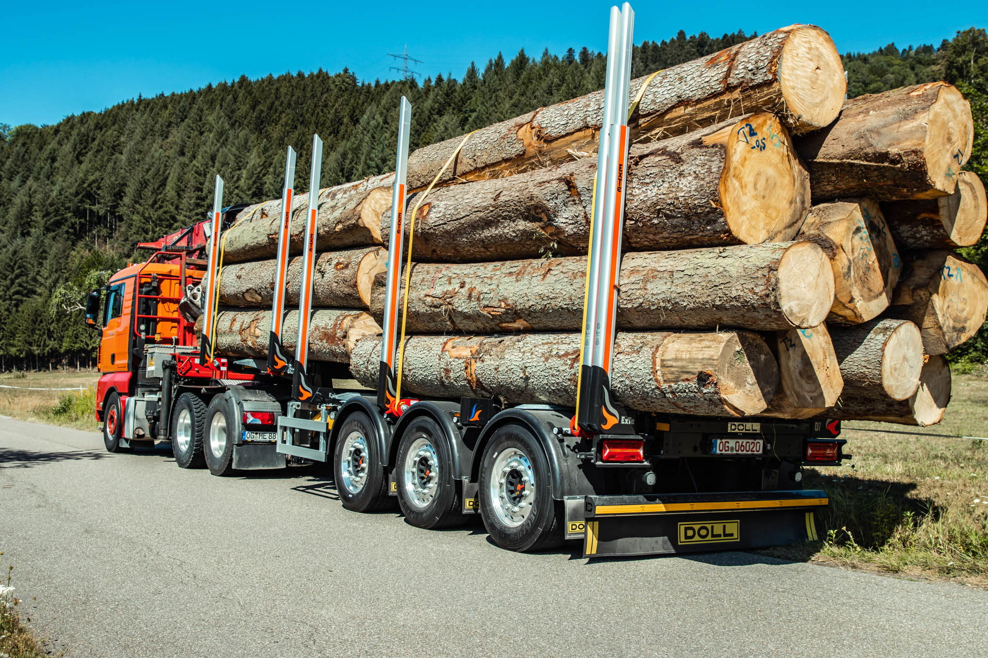 Der Sattelauflieger „LOGO 10“ ist für den Transport von 2 bis 6 Meter langem Kurzholz ausgelegt. Durch den gewichtsoptimierten Stahlbau hat das Fahrzeug ein niedriges Eigengewicht. Dadurch wird die Nutzlast auf 35 Tonnen deutlich gesteigert. Die spezielle Rahmenkonstruktion erlaubt es zudem, das Holz höher zu stapeln: Der stark gekröpfte Rahmen erhöht das Ladevolumen. Die Ladehöhe wird zusätzlich durch die versenkten Schemel reduziert, was ebenfalls mehr Ladung zulässt. Die niedrige Ladehöhe hat einen weiteren Vorteil: Der Schwerpunkt des Sattelaufliegers verlagert sich nach unten. Das verbessert die Fahrstabilität. Noch mehr Stabilität beim Fahren gewinnt das Fahrzeug dadurch, dass DOLL® die Räder weiter nach außen verlagert und die Spurbreite deutlich erhöht hat. Außerdem ist der Auflieger durch seine kompakte Bauweise auch auf engem Raum gut manövrierbar: „Der ‚LOGO 10‘ bietet je nach Variante Platz für bis zu vier Kurzholz-Stöße und ist so wendig, dass man im Wald auch auf engem Raum wenden kann“, betont Martin Sturm, Geschäftsführer von DOLL TimTech. „Gerade auf dem süddeutschen und österreichischen Markt wird meist 4 bis 5 Meter langes Kurzholz gefahren. Hier sind diese Fahrzeuge besonders gefragt, da sich mit ihnen zwei Holzstöße dieser Länge wirtschaftlich transportieren lassen“ Seit der Markteinführung im Herbst 2022 ist die Nachfrage für das Spezialfahrzeug konstant hoch. Mehr als 30 Fahrzeuge wurden bereits ausgeliefert und sind bei Kunden in Deutschland, Österreich und der Schweiz im Einsatz.