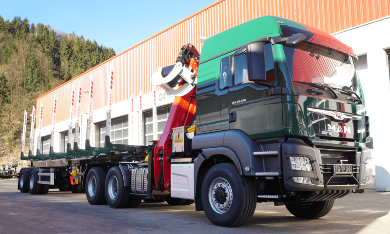 Dieser Sattelkupplungsaufbau mit Epsilon Z-Kran kommt inkl. MAN TGS 26.500 Truck auf ein Gesamtgewicht von 14,7 Tonnen. Der zugehörige LOGO21 (7,5 Tonnen) ist mit DOLL®-Spannwinden, ECCO Alu 9 Rungen sowie einer zuverlässigen Zentralschmieranlage ausgestattet