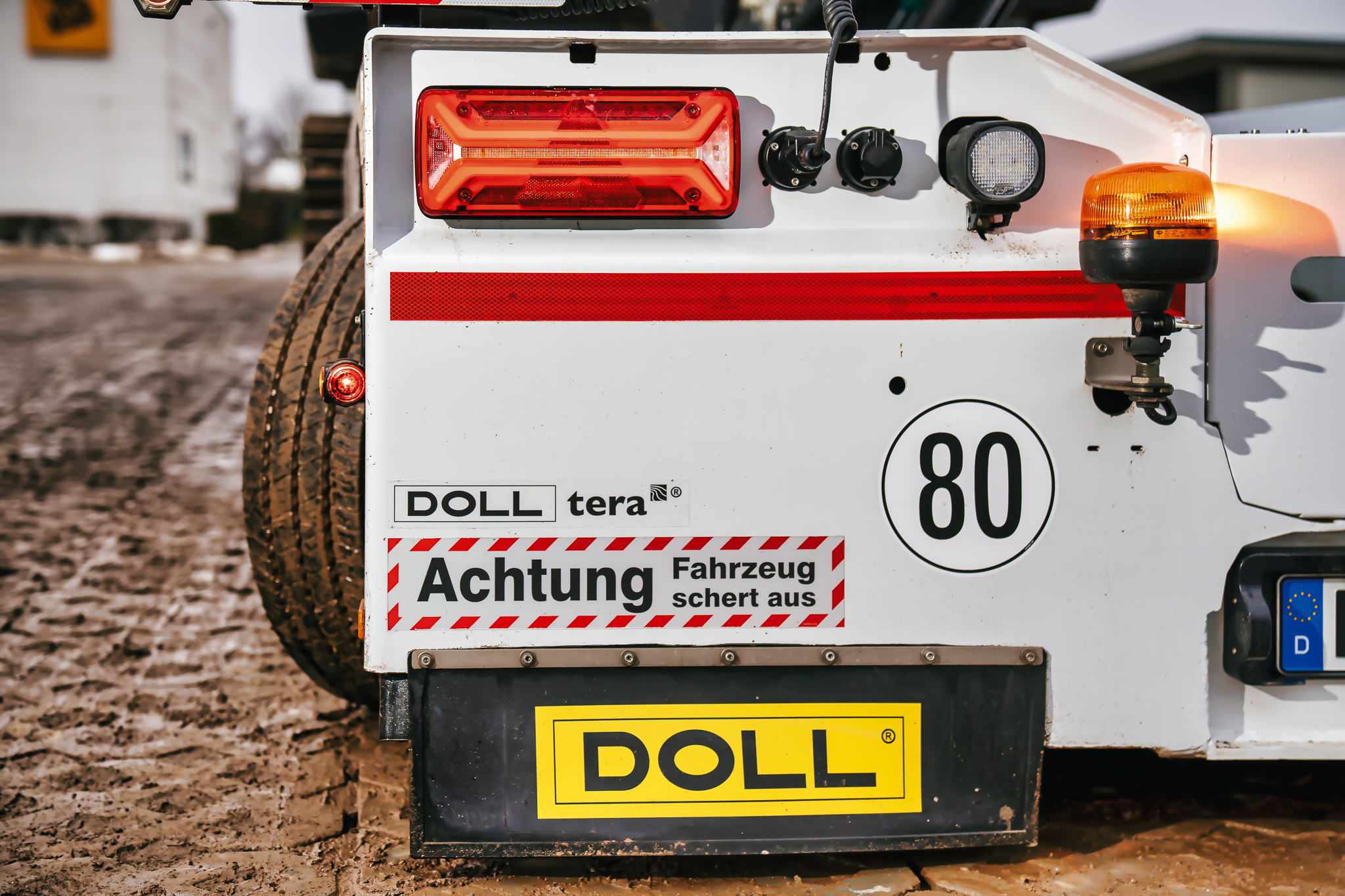 Das Rückgrat der DOLL® NEXT Tiefbetten bildet ein auf maximale Nutzlast ausgelegter gewichtsoptimierter Stahlrahmen. Die serienmäßig verbaute Pendelachse „DOLL tera®“ ermöglicht eine niedrige Ladehöhe von nur 300 Millimetern und bietet durch ihren hohen Achshub besondere Vorteile auf unebenem Terrain. Der Fahrwerkshub von bis zu 600 Millimetern hilft dem Fahrer, Höhenunterschiede auszugleichen und die Ladefläche anzuheben. Gleichzeitig hält die Pendelachse das Fahrzeug auch auf anspruchsvollem Untergrund waagerecht. Ein Lenkeinschlag von bis zu 60 Grad erleichtert das Rangieren auf engstem Raum.