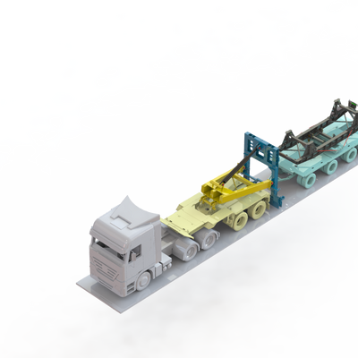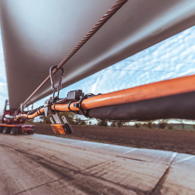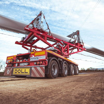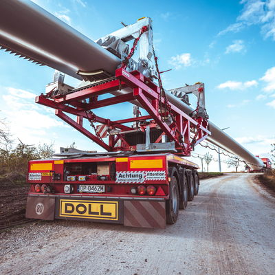 « L'utilisation du système novateur de DOLL® nous a permis d'effectuer le transport des pales de rotor les plus longues, lequel se serait révélé tout simplement impossible avec des types usuels de semi-remorques. La longueur totale de l'ensemble du système et de l'arrière-train auto-suiveur s'élevait à 87,5 mètres. »